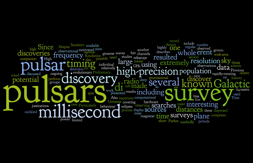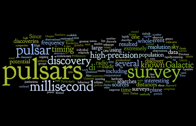 So while I work on my minor corrections, which are due pretty soon, here's a nice image of the words which crop up in my thesis abstract (courtesy of wordle). As you can see, the words 'pulsar', 'survey' and 'millisecond' crop up regularly - due to my project being a survey for millisecond pulsars. Once these corrections are done, then I'll probably post my whole thesis up here for no-one to read.